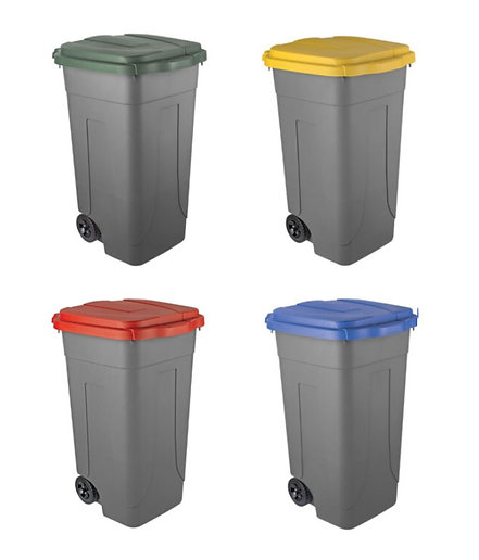Descrizione: polipropilene (Plastica Seconda Vita) riciclabile al 100%; capacità: 80 L; resistente agli agenti atmosferici, chimici ai raggi UV; due ruote e un coperchio ad apertura 120°; maniglia di trasporto ergonomica posteriore integrata e 4 ganci fissi fermasacco.