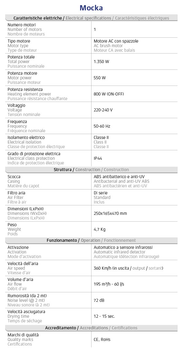Mocka catturerà la vostra attenzione per il suo design stravagante. Questo smart dryer, ideato per contesti a medio-alto traffico d’utenza, offre prestazioni d’asciugatura eccellenti, tipiche di un jet dryer, allo stesso livello di comfort di un tradizionale prodotto ad aria calda. Inoltre, la presenza di un termostato garantisce massima sicurezza, prevenendo surriscaldamenti, sovraccarichi e cortocircuiti. PROTEZIONE ANTIBATTERICA – La scocca è realizzata con uno speciale additivo che rende l’ABS antibatterico. L’attivazione tramite sensore a fotocellula previene il contatto con l’unità, rendendo l’asciugatura mani più igienica. REGOLAZIONE ARIA CALDA/FREDDA – A seconda delle preferenze dell’utente, è possibile inserire o disattivare la resistenza elettrica. Il selettore di temperatura (ON/OFF) è posto nell’incavo del vano d’asciugatura. SPIE DI CONTROLLO – Il pannello frontale ospita due indicatori a LED, uno verde ed uno blu, che identificano lo stato di funzionamento dell’apparecchio e l’eventuale entrata in protezione della macchina. SERBATOIO DI SCARICO – L’acqua d’asciugatura viene canalizzata in una vaschetta di recupero alla base del dryer. Il serbatoio è removibile per facilitarne lo svuotamento e la pulizia, così da prevenire la formazione di muffe e cattivi odori. FILTRO ANTIPOLVERE (DI SERIE) – Il dryer è fornito di serie con un filtro antipolvere, lavabile in acqua, che garantisce una maggiore purificazione dell’aria contro polvere, pollini e batteri. |