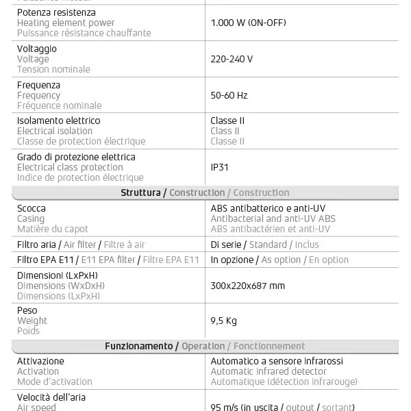 Bayamo offre tutte le prestazioni e l’efficienza di un jet dryer con il medesimo comfort d’asciugatura di un tradizionale prodotto ad aria calda. Un puro concentrato di tecnologia e funzionalità, senza sacrificare la sicurezza. L’unità incorpora un sensore in grado di rilevare la temperatura ambiente e regolare automaticamente il calore della resistenza, così da evitare inutili sprechi di energia. IGIENE GARANTITA – La scocca in ABS è realizzata con uno speciale additivo antibatterico e anti-UV. Nel dryer sono presenti due dispositivi LED a raggi UV che sterilizzano il flusso d’aria nel punto d’aspirazione ed in quello d’uscita. PANNELLO DI REGOLAZIONE INTEGRATO – Specifici selettori consentono di accendere o spegnere il dryer (ON/OFF); attivare o disattivare la resistenza; regolare la potenza del motore scegliendo tra due velocità dell’aria (HIGH/LOW). MONITORAGGIO CICLO D’ASCIUGATURA – Un display LED posto sulla sommità dell’apparecchio consente di controllare il tempo d’asciugatura. Due spie luminose identificano lo stato d’accensione e l’eventuale entrata in protezione del dryer. SERBATOIO DI SCARICO – Bayamo incorpora una vaschetta di recupero con funzione “troppo pieno” che cattura l’acqua d’asciugatura. Il serbatoio è estraibile, facile da svuotare e pulire, per prevenire la formazione di muffe e cattivi odori. FILTRI ARIA / EPA – Il dryer è fornito di serie con un pre-filtro d’aspirazione lavabile in acqua. In opzione, è possibile avere un filtro EPA E11, che garantisce una maggior purificazione dell’aria contro polvere, pollini e batteri. |