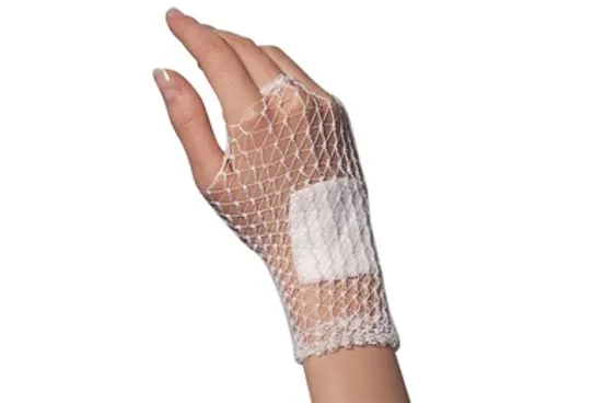 Rete tubolare elastica ideale per applicazione di medicazioni e aghi. La speciale struttura del materiale permette una tenuta priva di compressione.